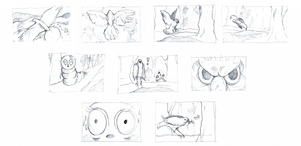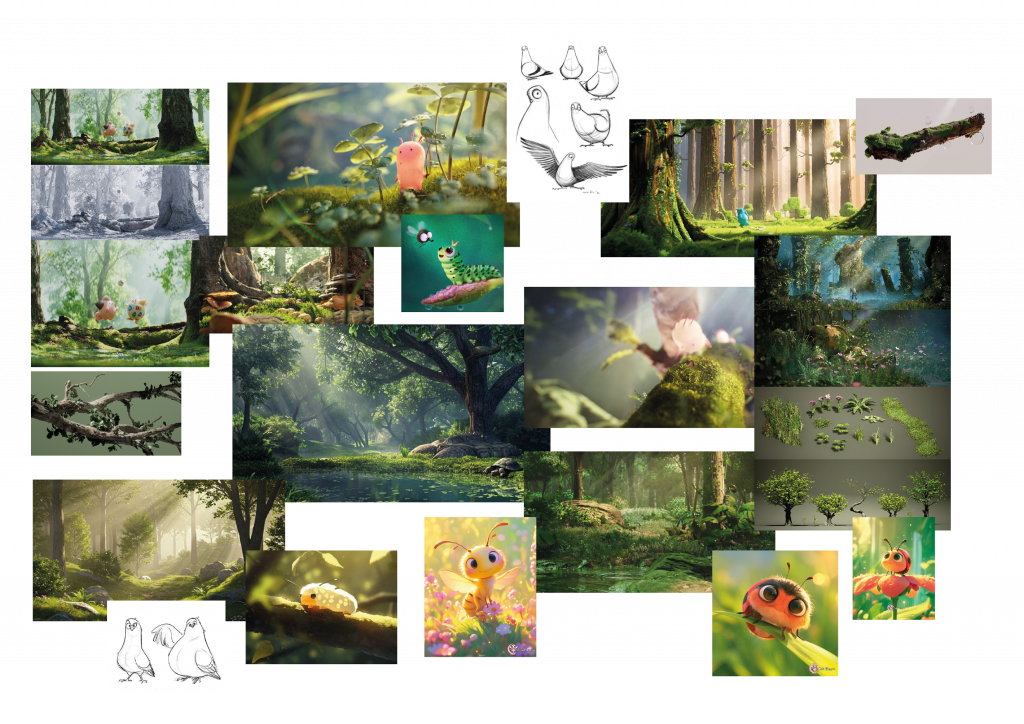 The aim of this project was to create a CGI environment rendered separately from the character and then composited together in layers. From the very beginning, I saw this project as an opportunity to push myself beyond my comfort zone and explore character animation, which I had never attempted before starting the MA. Approaching this unfamiliar area was both challenging and exciting, and it shaped the way I developed the project. I wanted to create a short animated piece with a light, humorous tone—something playful and enjoyable to watch—while also allowing myself space to experiment and learn through the process. This resulted in a simple narrative about a bird and its encounter with a caterpillar, a story that gradually unfolds into an unexpectedly drastic (at least for one side) ending.