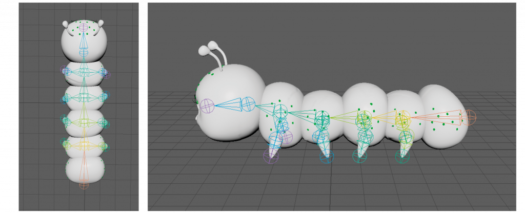 In the case of the caterpillar, I needed to create a rig that would allow me to move each section of its body, allowing it to fold and turn upwards, as well as joints for all the legs.