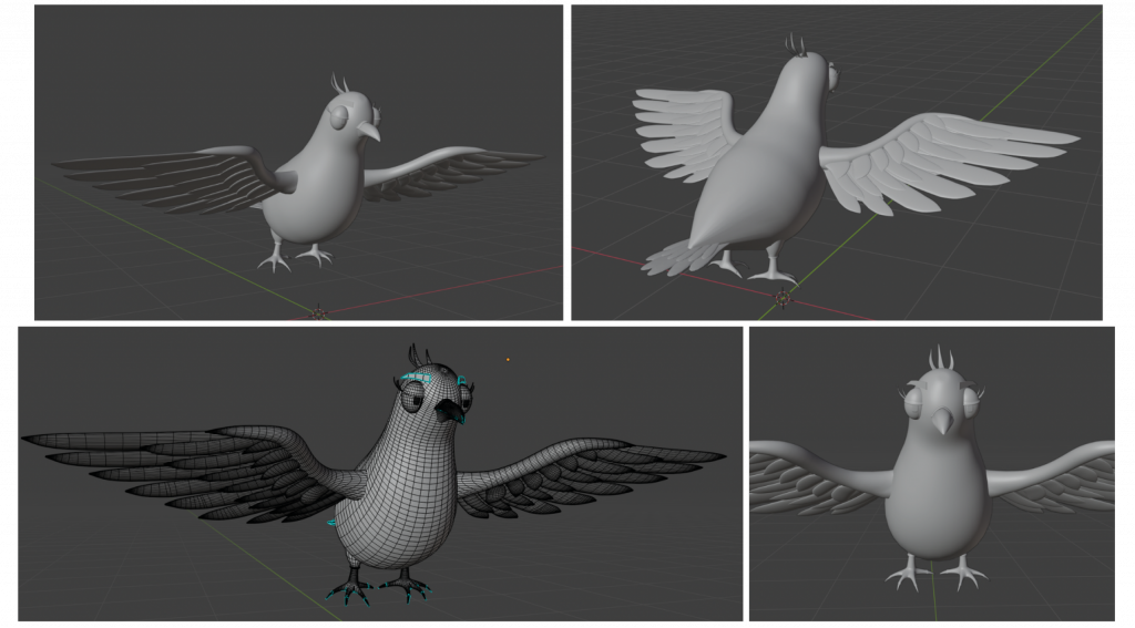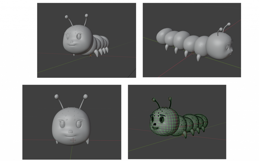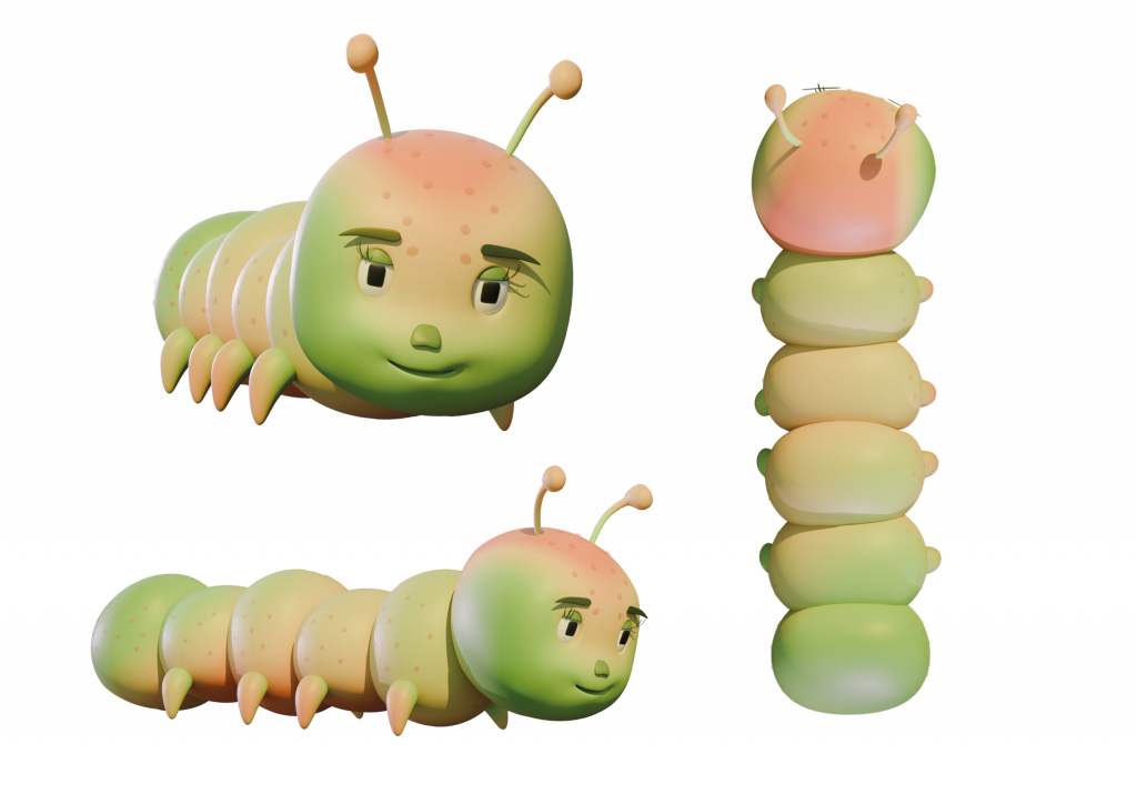 The next stage of the project involved modelling the characters. The two main protagonists of the animation are the bird and the caterpillar. As 3D modelling has not been my strongest skill, I decided to work entirely in Blender, a tool I was already familiar with from previous projects. This allowed me to focus more confidently on the creative and technical challenges ahead rather than the software itself. I also chose to work with simple, low-poly forms, both as a stylistic decision and as a practical one, as this approach made the rigging and animation process more manageable and accessible.