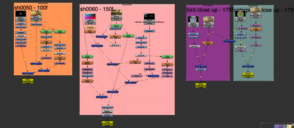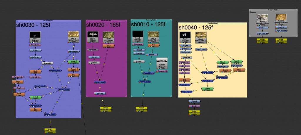I composited all of the shots within a single Nuke setup, separating them using different coloured backdrops.