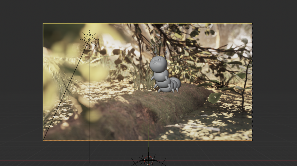 To ensure consistency in scale and movement, I exported selected elements of the forest environment and imported them into Maya. This allowed me to accurately position the characters and ensure that their movement aligned convincingly with the ground and surrounding elements. I then rendered the environment in Unreal Engine and used a single frame as a background image within Blender’s camera view, which helped me place the protagonists correctly within the final composition. Using the colours and lighting information from this background image as reference, I adjusted the character lighting accordingly before rendering them with an alpha channel for compositing.