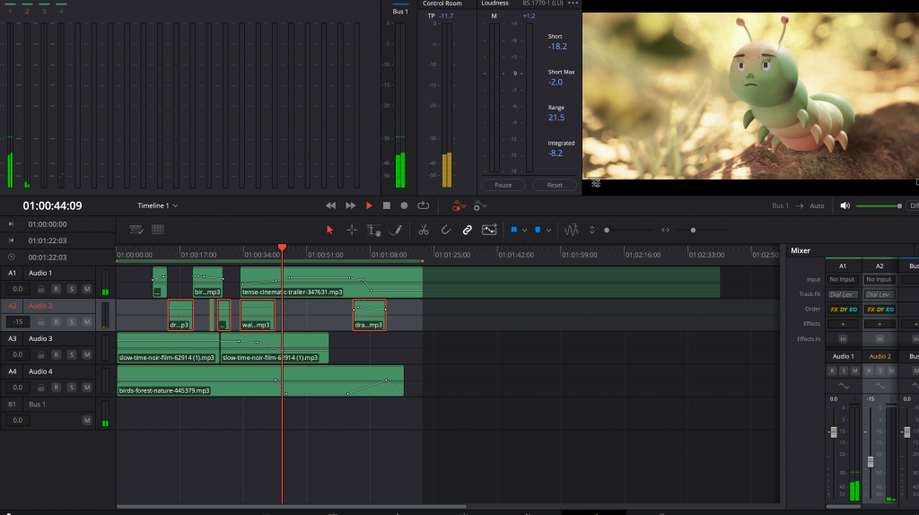 The final step was adding music and sound effects to the scene. I chose light, playful music that transitions into a more tense tone at the moment of the characters’ confrontation. As a second layer, I integrated wing movement sounds, carefully adjusting them to match the animation as closely as possible. I also added sound effects for the caterpillar moving along the fallen branch and for the bird drinking water. The third layer consisted of ambient background sounds, such as birds chirping and leaves moving in the wind, which helped establish the overall tone of the animation.